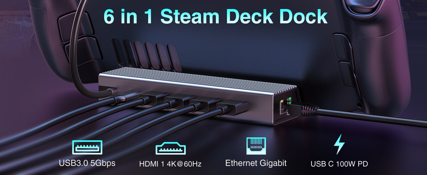 - 【Steam Deck Dock 6-in-1】The stream deck dock equipped with 6 ports: HDMI(4K@60Hz), Gigabit Ethernet(1000Mbps), 3*USB3.0 ports(5Gbps), USB C PD charging(100W). Note: NOT compatible with Protective Case with Kickstand, please make sure the thickness of the protective case is less than 2mm.