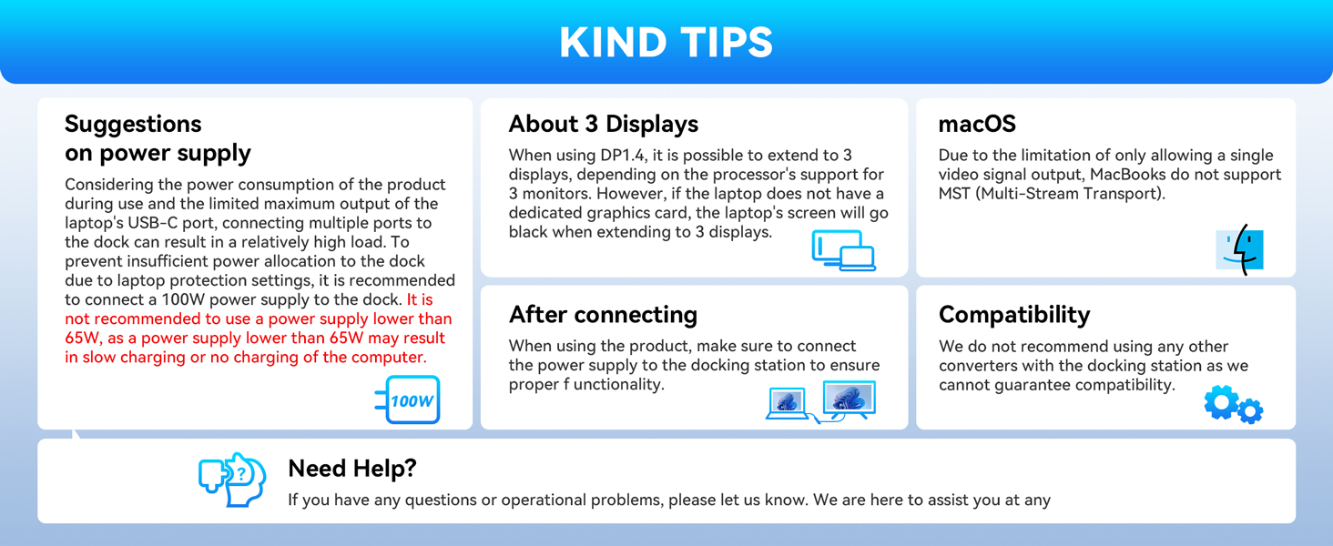 - Fast 100W Power Delivery Port: This lenovo docking station support power delivery max 100W, safe power out is rated at 87W, for 8W of power will allocated to the hub to keep its ports work. Please use at least 65W power adapter to charge your laptop via this hub,using lower power charger may cause a low charging warning and slower charge for your laptop than it should, and make sure your device support power delivery protocol,otherwise it won’t charge for your laptop.