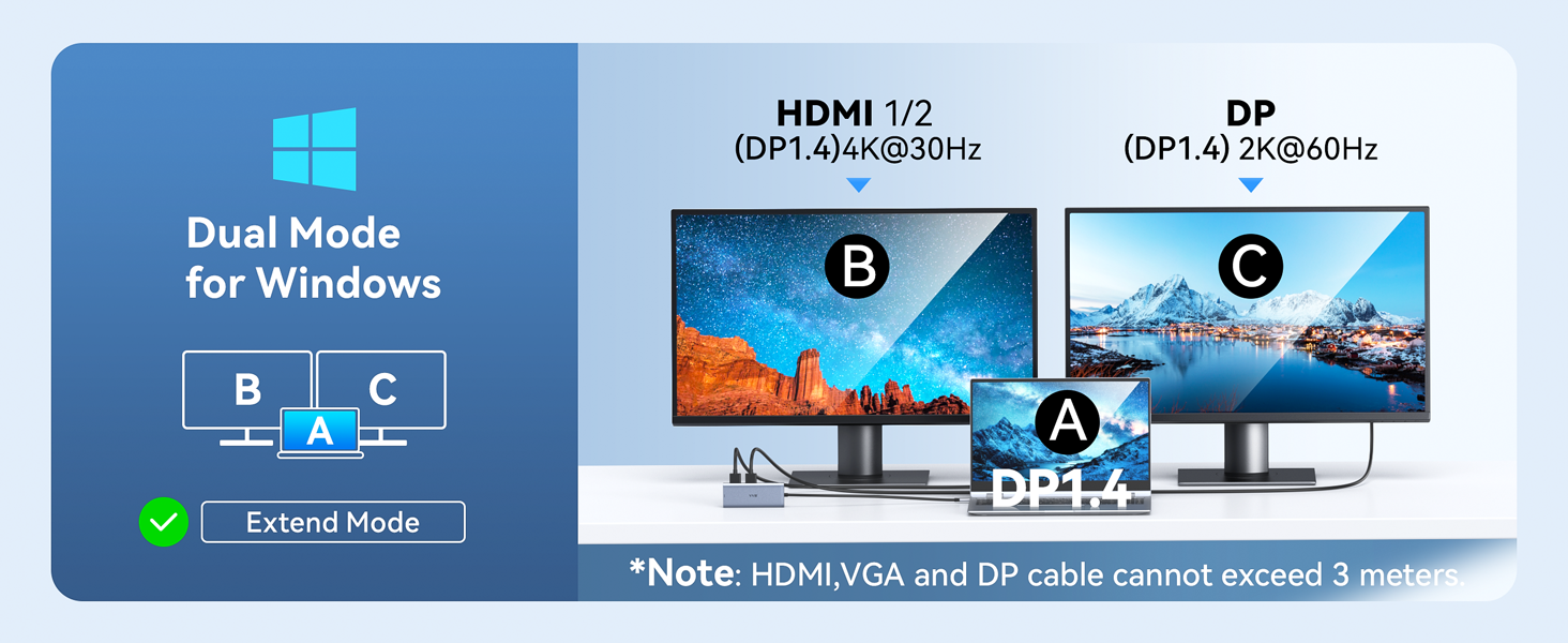 - 4K@60Hz High-definition Image: The usb c docking station dual monitor can easily to achieve dual monitor and triple displays for Windows(Note:MacBook laptops not support dual /triple displays). Single use HDMI 1/DP,resolution up to 4K@60Hz, single use HDMI2,resolution up to 4K@30Hz. USB C adpter connecting with 2 hdmi ports or hdmi1/2+display ports,dual monitors will be 4K@30Hz and 2K@60Hz(DP1.4). usb c docking station connecting with dual hdmi+Display ports,triple monitors will be 1080P.
